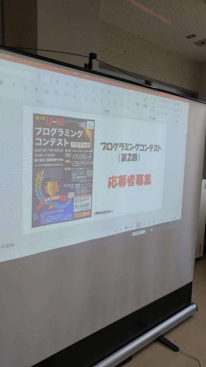 プロコン=プログラミングコンテスト です!自分が伝えたいことを「Scratch(スクラッチ)」で組んだプログラミングで表現し、それを発表して評価を受けるものです。社会性のあるテーマで入賞をめざします!