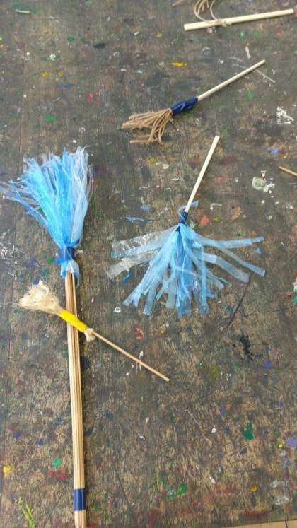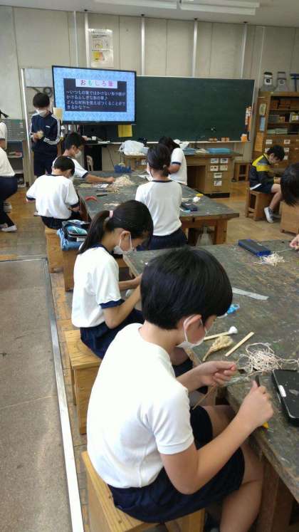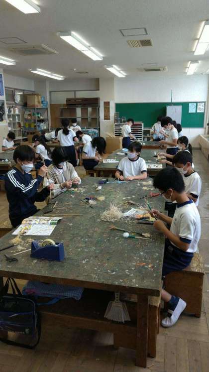 専科の授業も始まっています。6年生は…おもしろ筆…というものを作っていました。麻紐やスズランテープ、毛糸、綿、竹ひご…いろいろな材料を筆先にすることで、いつもの筆では描けない形や線が描けるようです。…まるで魔法の筆ですね!