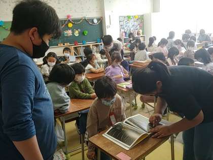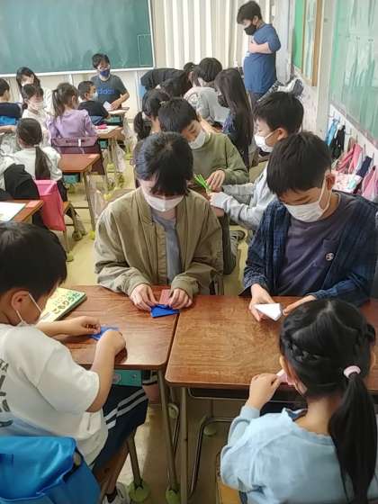 渡しただけではなく、その1年生と一緒に折り紙をしたり、絵を書いたり、本を読んだりして過ごしました。