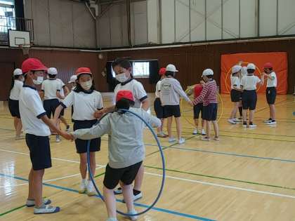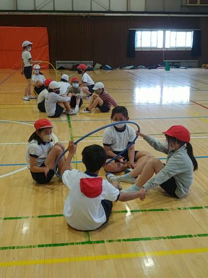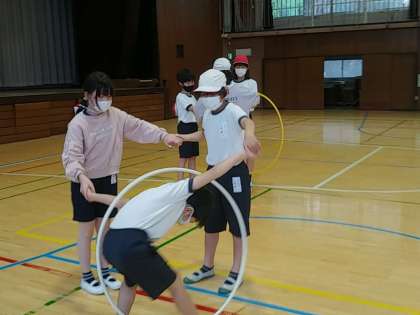 そこで、何人かで手をつないで輪になって、その手を離さないでフラフープを一周させるという輪くぐりゲームに取り組みました。