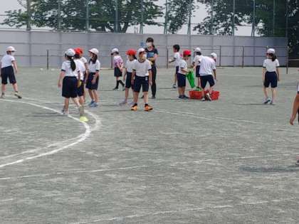 バトンを渡すことを重点に指導するため、校庭に2つの円を描きました。