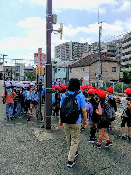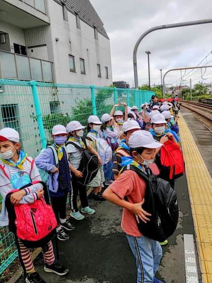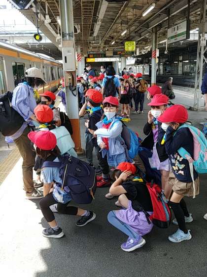 子どもたちは、ホームが濡れていたので、座らずに立って、電車を待っていました。待ちながら、先生の言葉がなくてもリュックを前に抱えて準備できる2年生。成長していますね!
