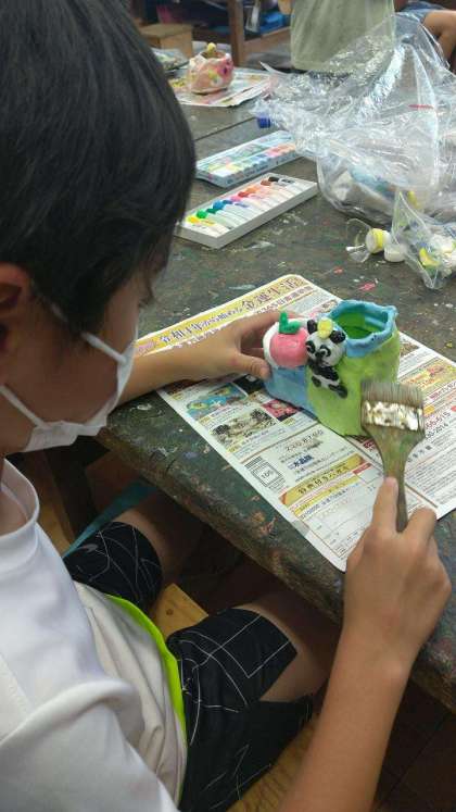 図工で製作してきたハッピー小物入れに、完成のときがきたようです。鮮やかな色の紙粘土で作られたかわいいキャラや模様、入物全体の形も工夫されていてステキです。