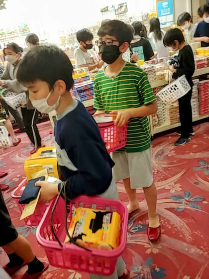 3組の子どもたちは、お買い物を始めると、なんだかかさばるものをたくさん買っています。
