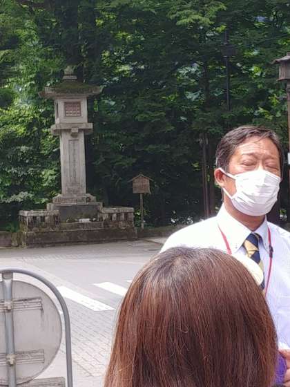9時25分。東照宮の見学が始まりました。見学のまず最初は、八王子千人同心の碑です。八王子千人同心は、東照宮を火事や犯罪等から守りました。その功績を讃えられて碑が建てられたそうです。八王子の子どもたちの先祖が長きに渡って東照宮を守っていました。それを記念して建てられた碑。子どもたちは、感慨深そうに見ていました。