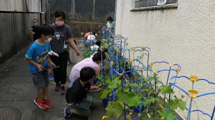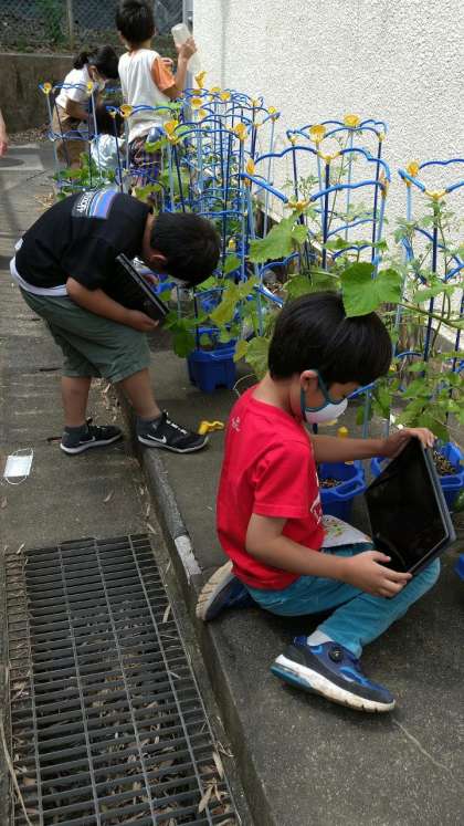 副校長先生!見て見てー(*^_^*)と、子どもたちが笑顔いっぱいで見せてくれたのは、鈴なりに実をつけた小さな緑のミニトマトやまだまだ小さなぺったんこのサヤを付けたエダマメ…5センチほどの実をぶら下げたキュウリも!