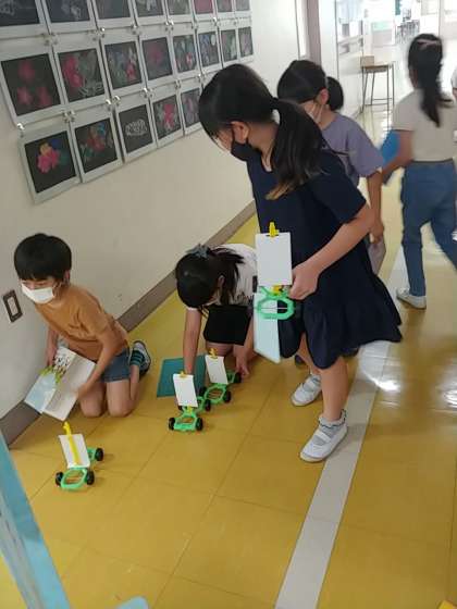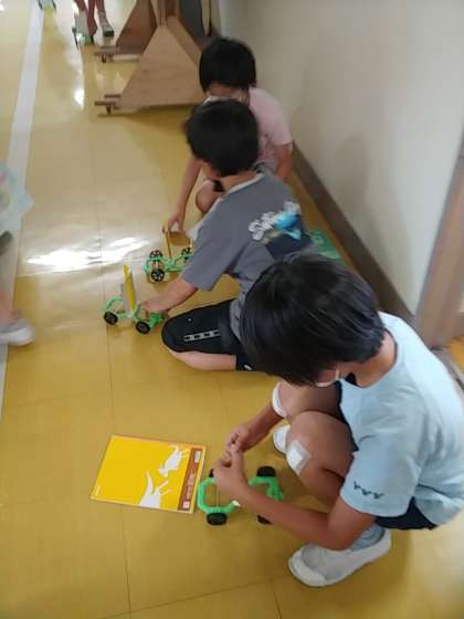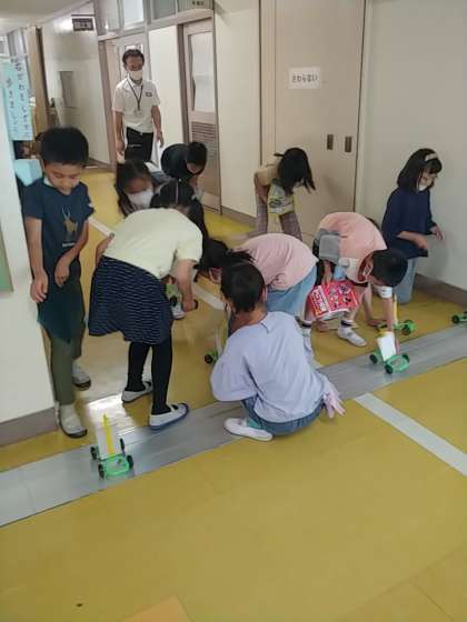 子どもたちは、キットの車を作り、帆をつけて廊下に出ました。廊下に出た子どもたちは、とっても嬉しそうで、下敷きを持って一生懸命に自分の車に向かって扇いでいました^_^
