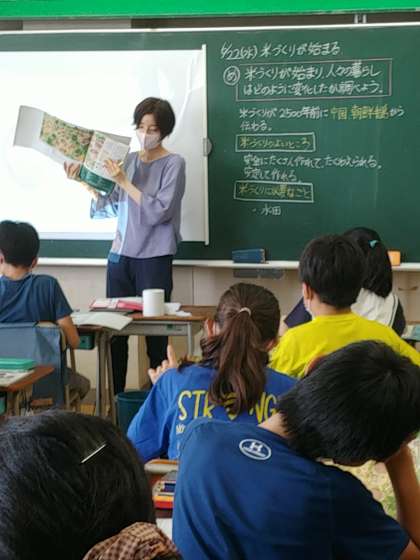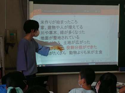 6年生の一つのクラスでは、社会科で「米作りが始まる」の学習を進めていました。授業では、まず子供たちが教科書の挿絵から気がついたことを見つけて行きました。そして子どもたちの発見を画像として映し出し、「なぜこうした変化が起きたのか」について考えていきました。