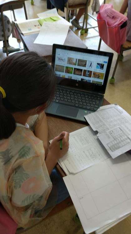 図鑑やインターネットを使って調べたことを、付箋を使って整理しながら文章でまとめていました。