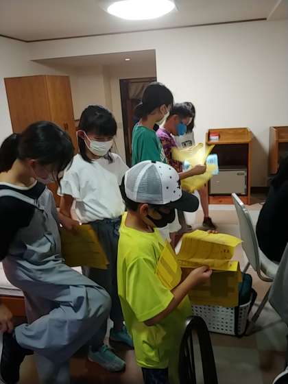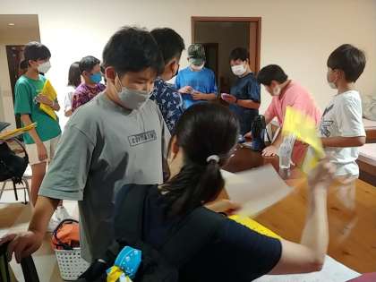 現在、19時25分。今は、夕食の後の健康観察の時間です。なぜ、このタイミングで検温をし健康観察を行うかと言うと、お風呂に入った後に検温をすると、体温が上がってしまい、本来の体温が測定できないからです。各生活班の保健係さんは、自分の部屋で健康観察を行い、その健康観察カードを保健室に持って集まってきていました。