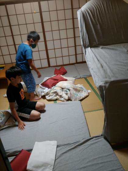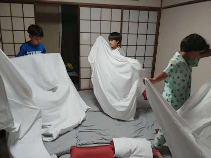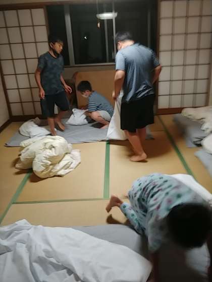 これまでの移動教室では、お布団を早々とひき、結局寝る時になって布団がクシャクシャになってしまい、お布団を敷き直すという事もありました。