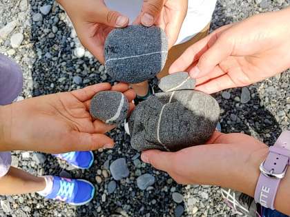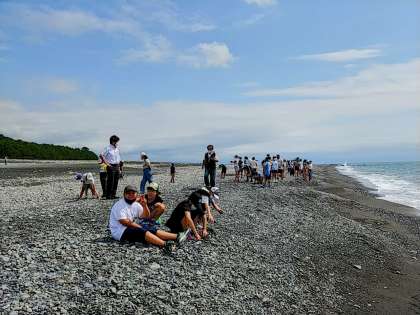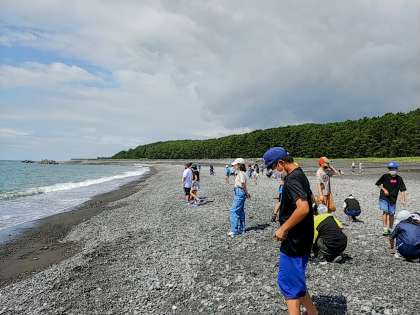 子どもたちは、まずクラス集合写真を撮りました。そして、広大に広がる太平洋を目の当たりにして、はちまき石を見つけたり、のんびり海を見たりして、しばらく海岸を楽しんでいました^_^