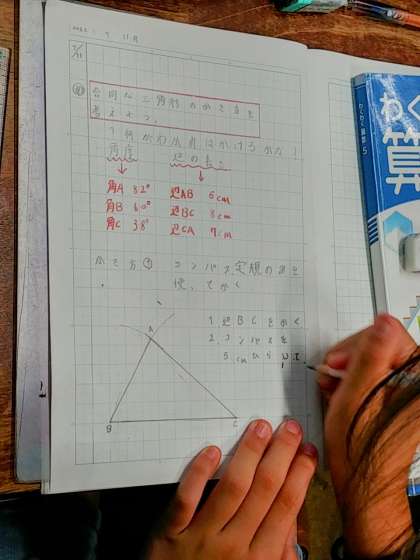 「では、角の大きさや辺の長さに気をつけて、合同な三角形を書いてみよう」ということになりました。