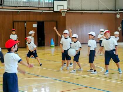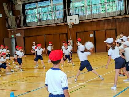 夢中になるので、ボールの取り合いになるのかなと思ってみていると、ボールを二人の子がさわった時に、自然とじゃんけんをして勝った人に譲るという場面も見られました。また、あまりボールに触っていない子に、ボールを渡してあげるという子もいました。