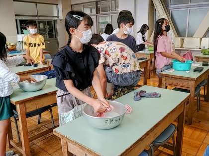 子どもたちは、洗面機に洗剤を入れて、よく混ぜ、その中に靴下を入れました。