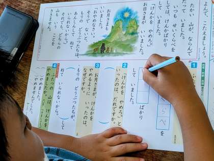 机の上には「けんかしたやま」と書かれているテストがあります。