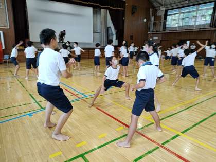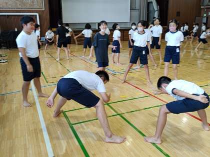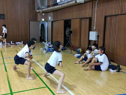 そこで、5年生は、まず、5、6人のグループを作りました。そして、お互いの演技を見合ったり、上手な人に見てもらったり、見せてもらったりしながら、演技の練習をしました。