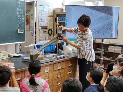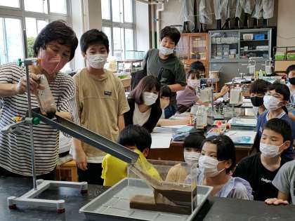 地層は水の働きと関係があることから、ペットボトルに、砂や土、小石などが混ざった泥を入れ、それを何回か繰り返して流していくと、大きい粒が下に来て、小さい粒が上に積もるという地層ができていきました。