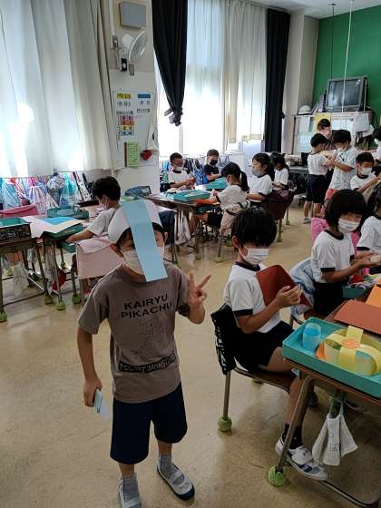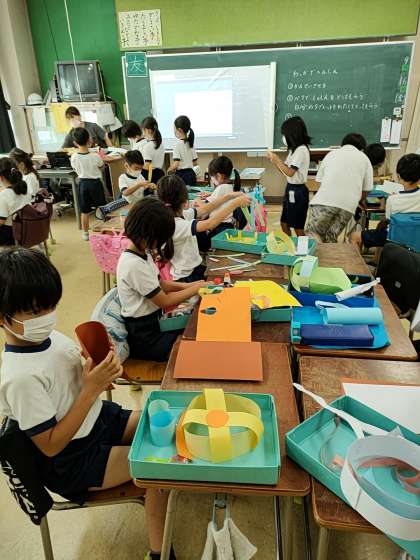 2年生の1つのクラスでは、図工で「わっかでへんしん」をしていました。