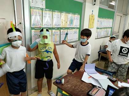 子どもたちは、かぶとや体に巻く鎧などいろいろなアイテムを作って変身をしていました。