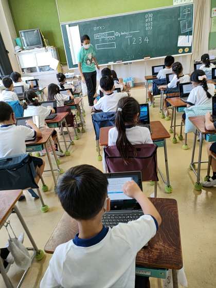 子どもたちは、先生のお話をよく聞いて、タブレット端末を立ち上げること、ログインすること、シャットダウンすることなど、基本的な操作を教えてもらいました。