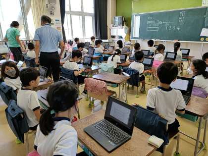 1人一台のタブレット端末を子どもたちの机の上に載せました。子どもたちの顔がニコニコになりました(^o^)