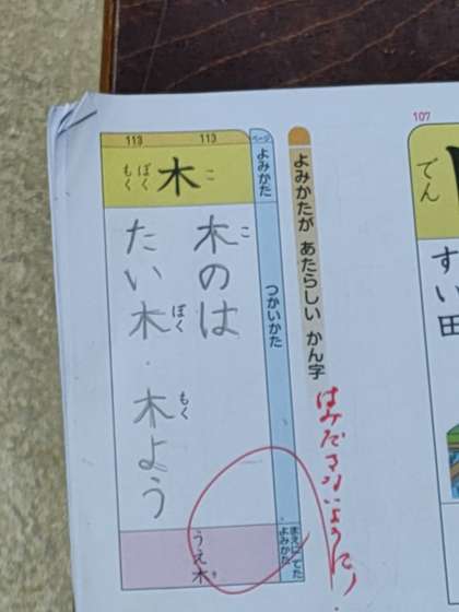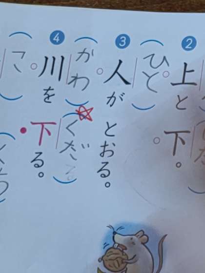 すると2つの新しい読み方の漢字のところでした。1つは「下る」の読み方です。「下」はいろいろな読み方がありますから、難しいですね。まちがえている子どもたちは「くだ」と書き直しました。そしてもう一つが、「木のは」です。これも新しい読み方ですが、「きのは」と読むこともありますが、正解は「このは」です。