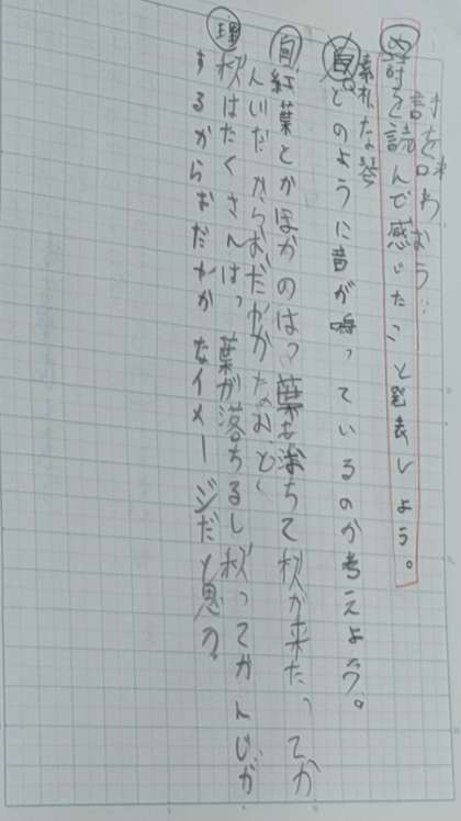 秋の美しさを琴の音色によって描くというとても高度な詩で、子どもたちも読んだ感想を言うのに、ちょっと躊躇していましたが、一人二人と発表する中で、少しずつ感想を発表することができるようになりました(^o^)