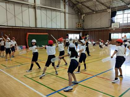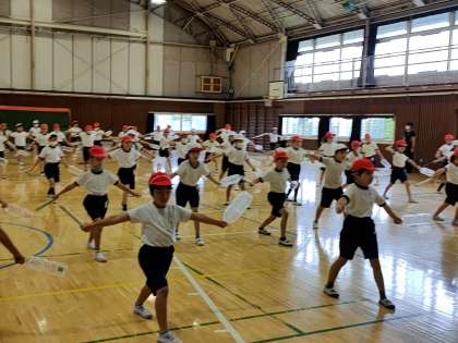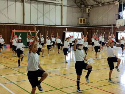 3年生は、体育館でエイサーの練習をしていました。