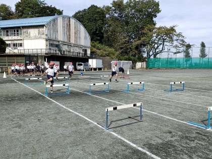 今日は、まず最初に、どちらの足で踏み切るのかを一人一人確認しました。そして、踏み切る足が決まったら、いよいよハードル走です。