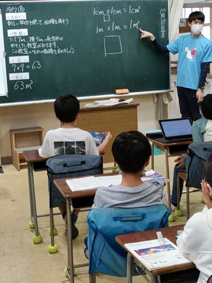 今日の授業では、そうした面積の公式も学習した後の学習。平方mについて学習しました。