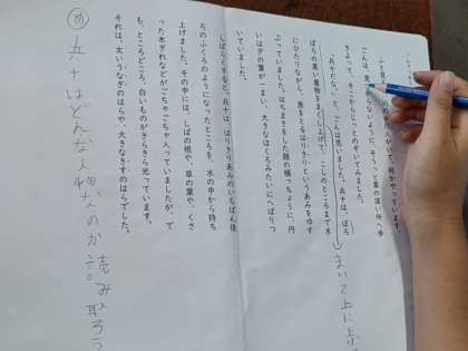 今日は、本文の最初のところから、主要な登場人物である兵十の暮らしや人となりがわかるところに線を引き、そこからどんなことがわかるのかを話し合いました。