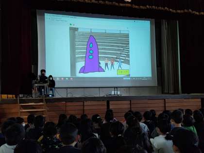 表彰では、スポーツをがんばっている2人を紹介した後で、今年度のプログラミングコンテストで表彰を受けた子どもたちの紹介をしました。