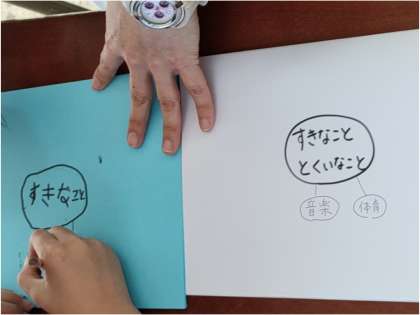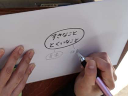 初めてということで、コグトレ棒で少し体幹を確認したあとで、好きなこと得意なこと、苦手なことを書き出す学習をしました。