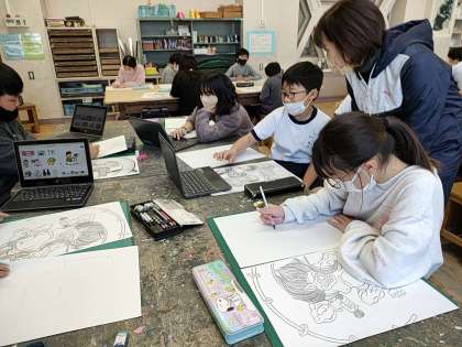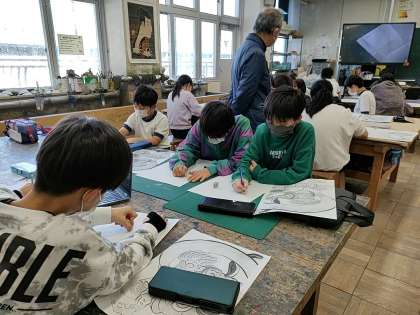 5年生の図工は「夢をかなえて風神雷神」というテーマで絵を書き始めました。
