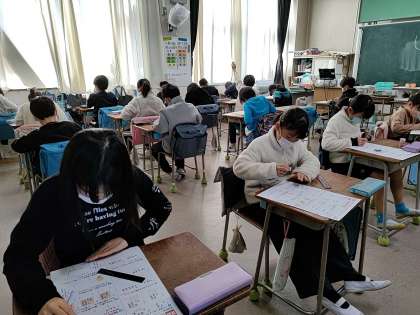 4年生は、今日、算数の時間に「小数のかけ算、わり算」のテストをしていました。