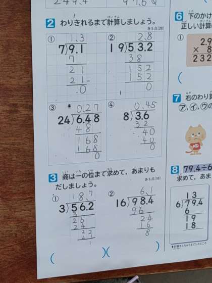 小数のわり算もただひっ算をすればよいのではなく、概数で答えを出したり、余りがあったりと、よくよく気をつけて答えを出さないとまちがえてしまいます。なぜなら、小数点があるからです。特に余りは整数で出ますから、それに小数点を打たなければいけません。