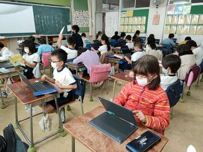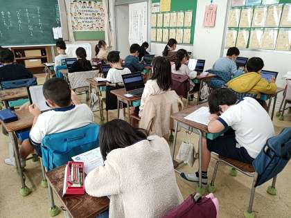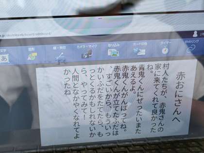 2年生の1つのクラスでは、テストに取り組んでいました。そして、テストが早く終わった子が、タブレット端末で、「泣いた赤おに」の作品を読んで、その赤おにさんか青おにさんにお手紙を書いていました。