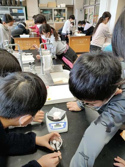 子どもたちは、どの班も協力して準備をしていました。そして、きっちり100グラムの水を用意して、10グラムの食塩を用意しました。