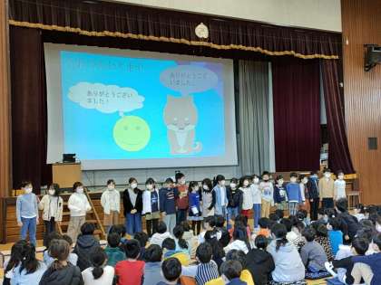 まず、2年生の子どもたちが、文化祭で演じた「ひょうたん池は大さわぎ」のことについて発表をしました。