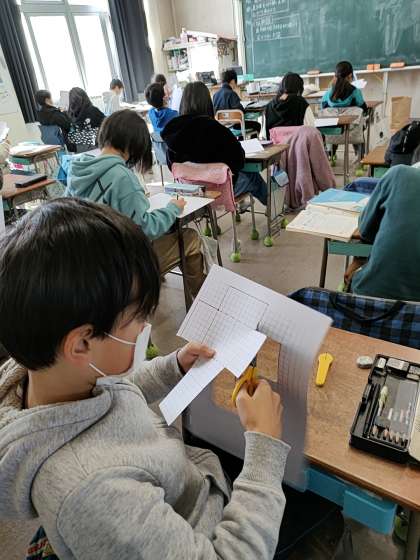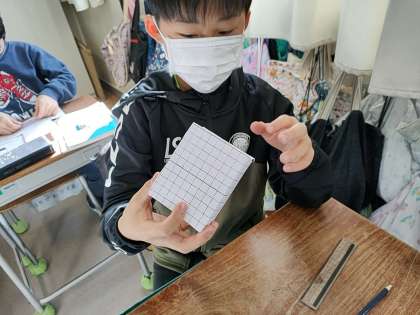 授業では、先生が作ってほしい直方体の大きさを示し、それを見て子どもたちが完成をイメージしながら作っていきました^_^