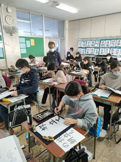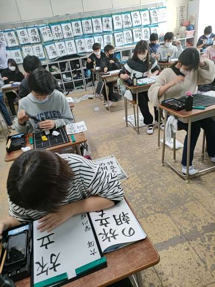 6年生の1つのクラスでは、書写で「旅立ちの朝」という文字を書いていました。