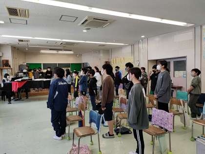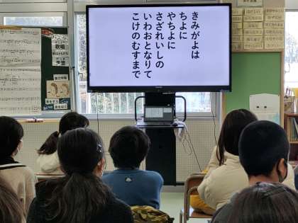 今日は、まず国歌「君が代」を歌いました。次に5年生と一緒に歌う「旅立ちの日に」を2部で歌いました。