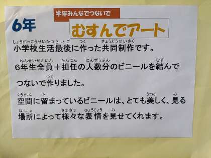 6年生の子どもたちと先生で一人1つつないで作った共同作品「むすんでアート」。