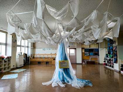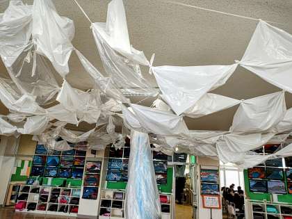 子どもたちが結んだビニールは雲のようでもあり、樹木のようでもあります。