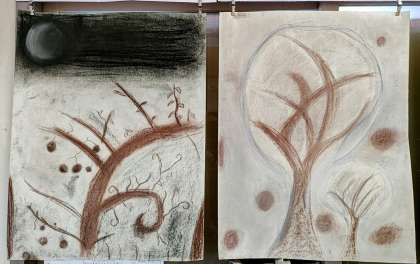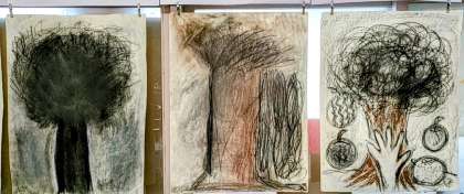 木炭を使って、彩色し、消しゴムを上手に使って、木を浮き立たせていきました^_^