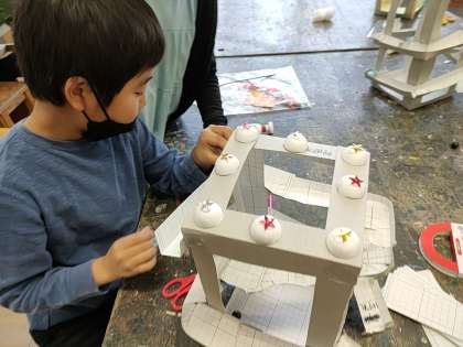 今日は、ビー玉を転がすコースだけでなく、その他の装飾をつける活動をしていました。