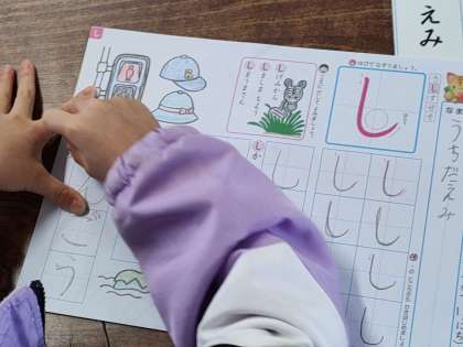 今日は1年生の学びタイムの様子を見ました。今日の1年生は、ひらがなの学習プリントの直しをしていました。