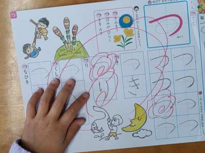 国語の授業で学習するひらがなはひらがなプリントを使って行います。その子どもたちのひらがなプリントを先生が丸をつけて、この時間に返していました。