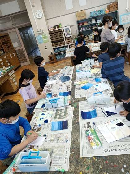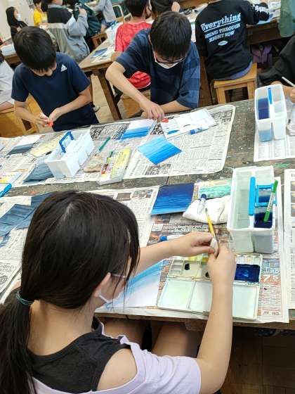 子どもたちは、まず小さな紙を使って練習をしました。まず紺色を濃く塗り、水をたっぷり含ませた筆で、その色を溶かすように塗っていきます。すると、だんだん薄くなっていって、きれいなグラデーションができます。